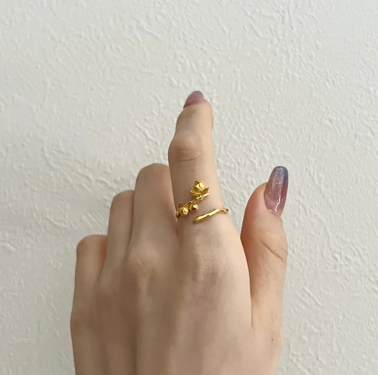 花びらと蕾のうち一つにはマット加工を加えており、艶とのコントラストが美しいアクセントに。立体的なデザインのため、小ぶりながら存在感があり、手元を見るたび気分が華やぐリングです。